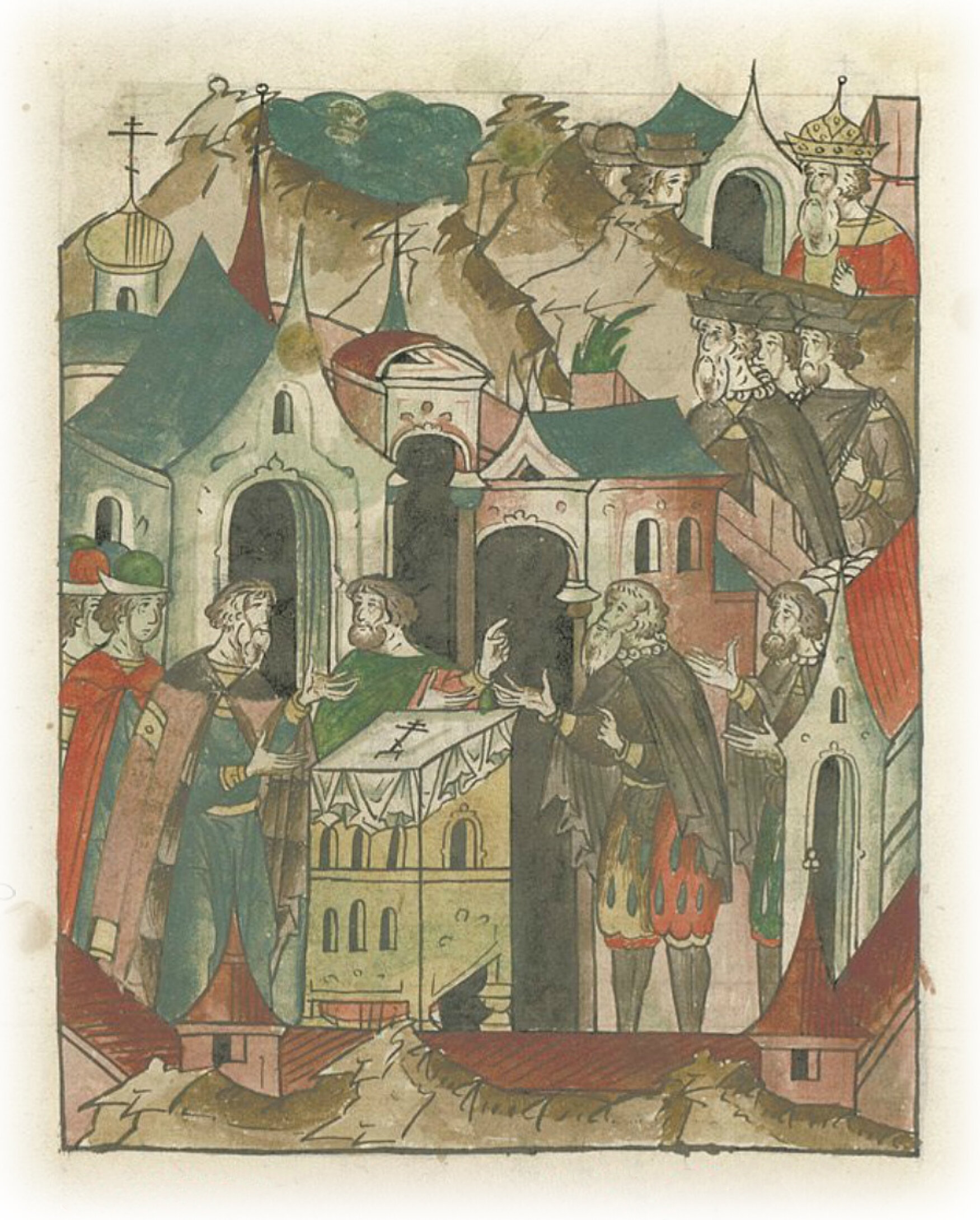 Посол от Римского короля Максимилиана Юрий Делатор приходит к великому князю Ивану Васильевичу и приводит его к целованию на договорных грамотах.