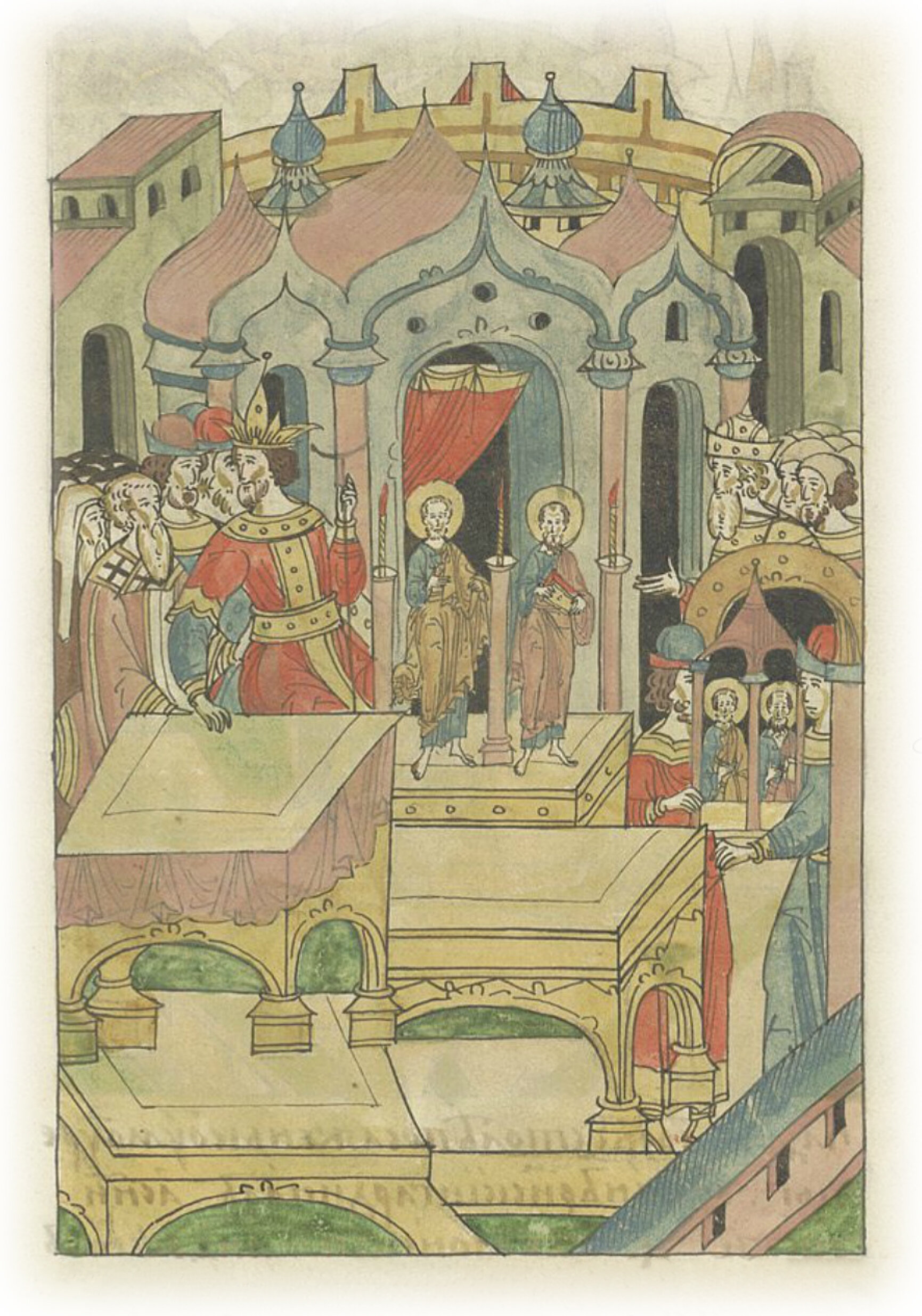 И тогда внесли и поставили серебряные позолоченные литые (статуи) святого Петра и Павла, и перед ними поставили три зажженные свечи и столы для философов, а перед царем также поставили стол для богословов.