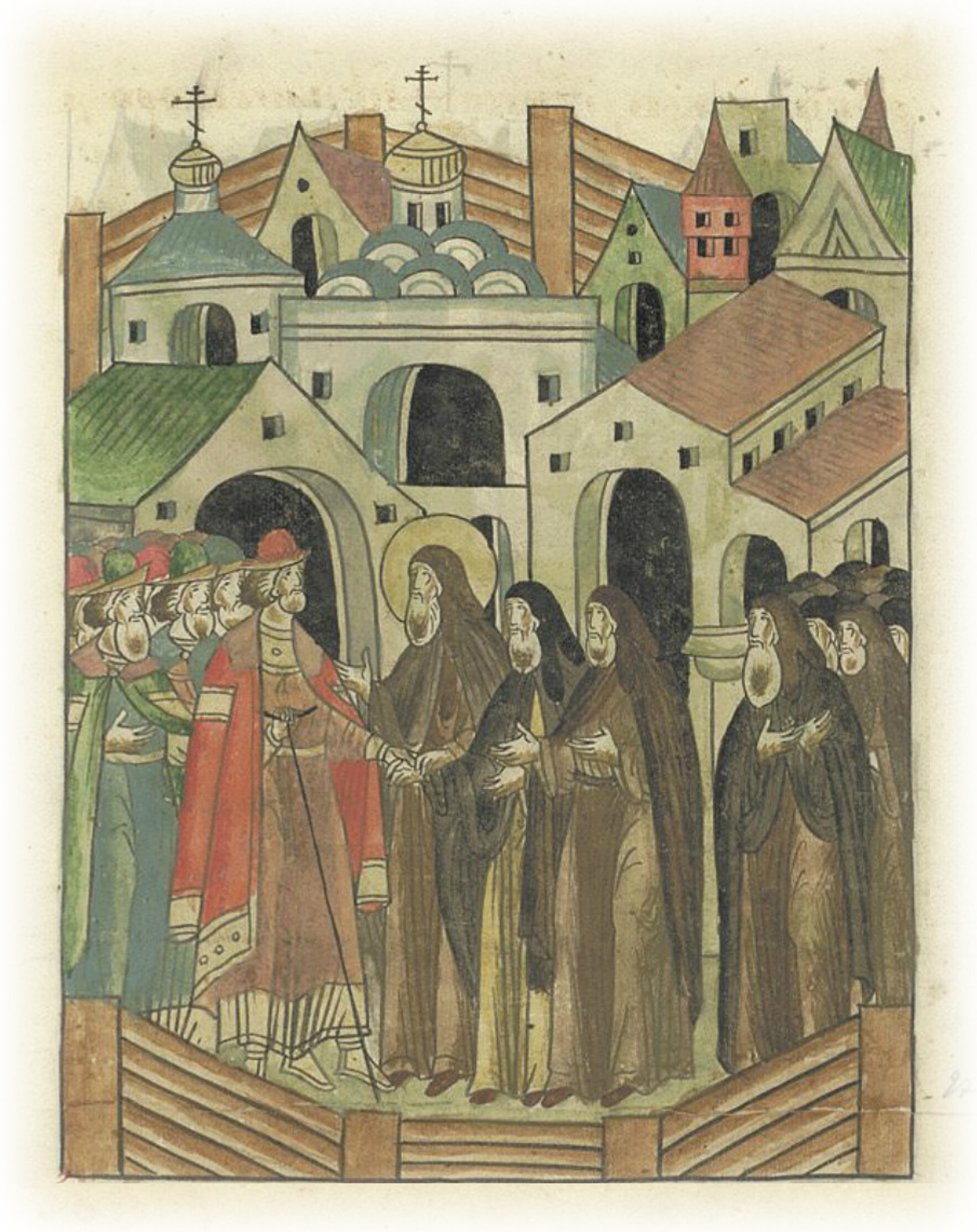 Преподобный игумен Сергий отдает воинов Пересвета и Ослябю в подчинение великому князю Дмитрию Ивановичу.