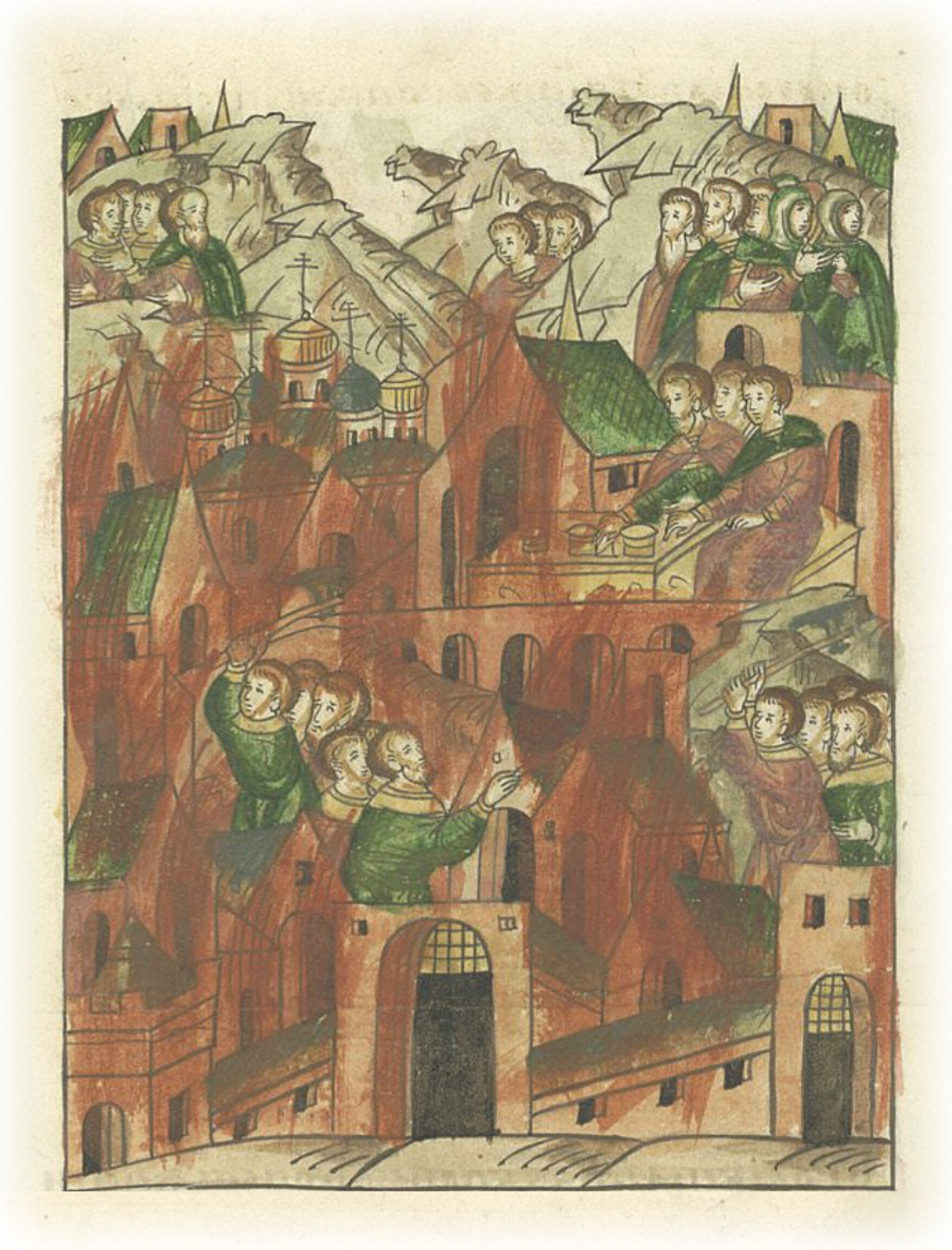 В том же году месяца июля в 21 день загорелся город Москва от церкви святого Афанасия, что внутри города, люди только отобедали. И чуть весь город не сгорел. Сгорел Кремль, мало что от него осталось, так что к вечеру едва погасили.