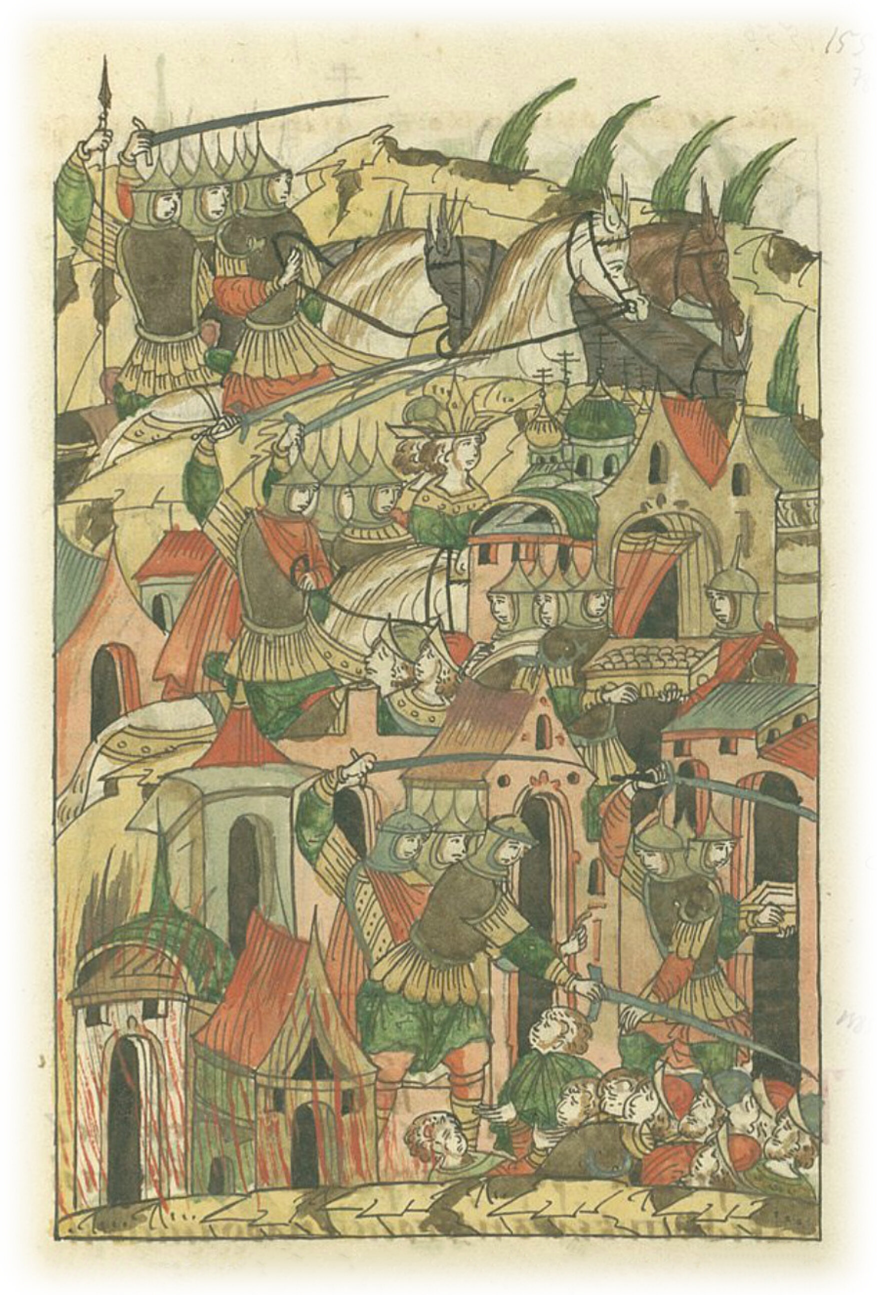 И пленили население города, а посады захватили и сожгли, людей убили без числа, а богатство их забрали себе.