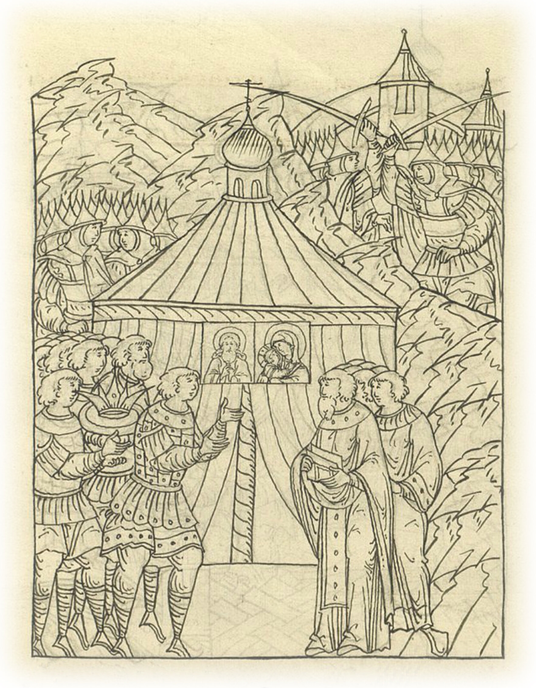 Царь же благочестивый, стоя в церкви, молил Создателя Бога, а также и все люди с великим воплем и плачем истинным, сердечным призывали Бога на помощь (и священники, служащие в алтаре, со слезами литургию совершали).