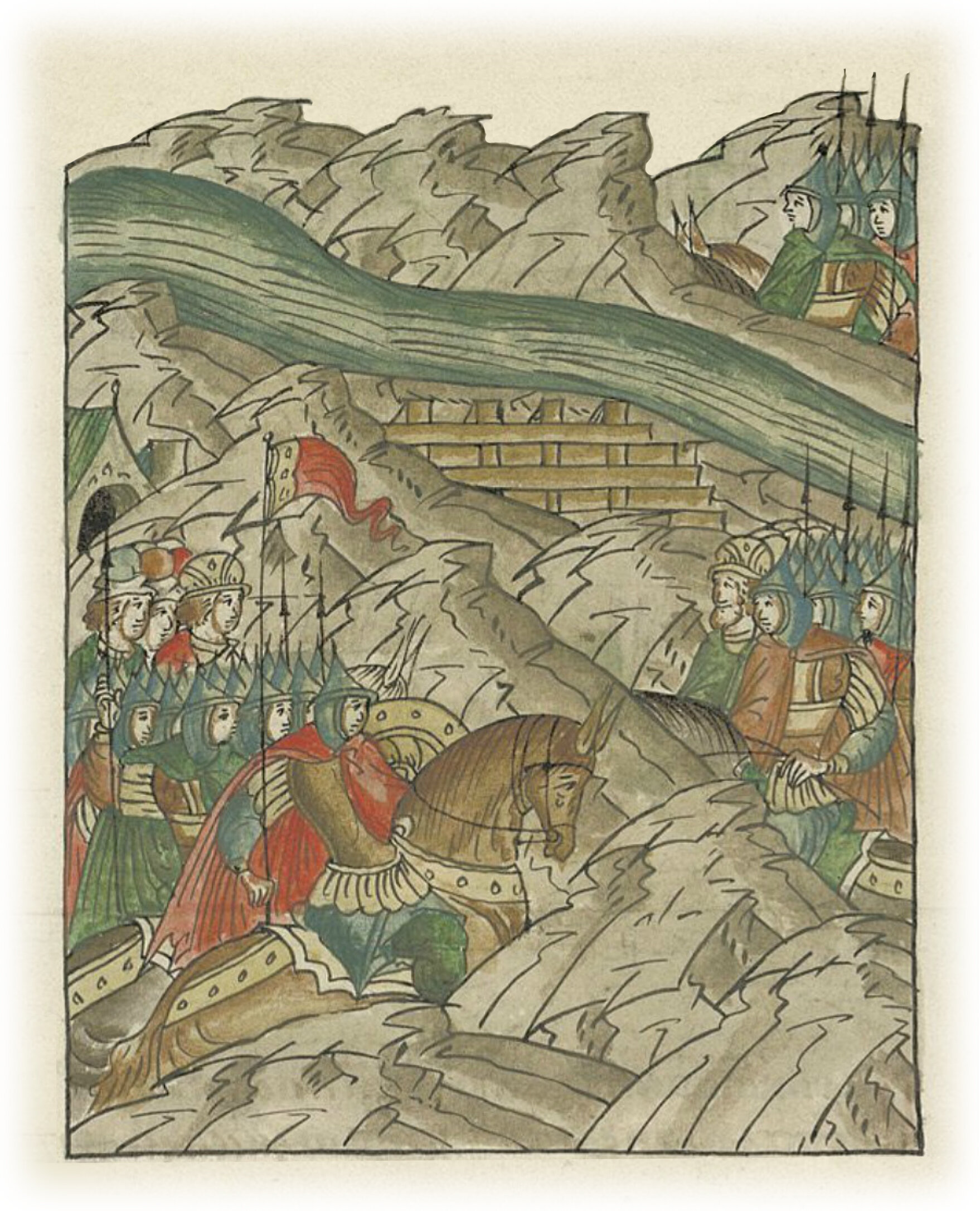Языки говорят воеводам царя Ивана Васильевича, что магистр окопался большим рвом вокруг города Рындола, бьет из пушек и пищалей и приступает к Рындолу.