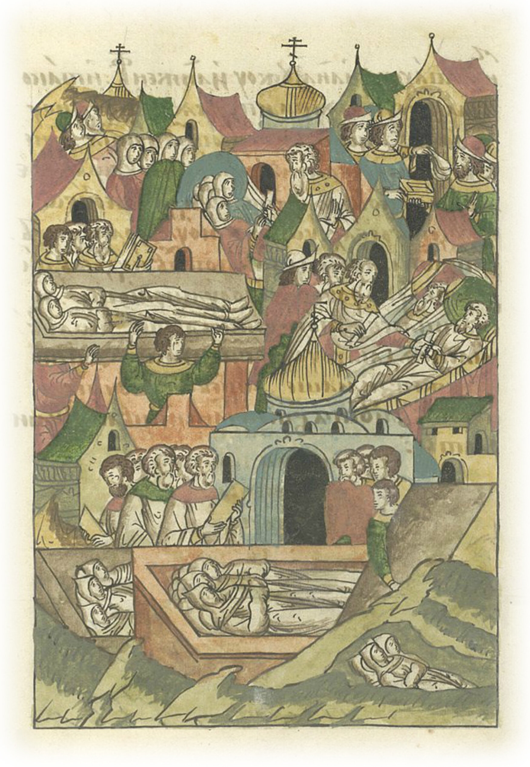 Сильный мор во Псковской земле, от которого умирает такое большое количество людей, что их становится негде хоронить.