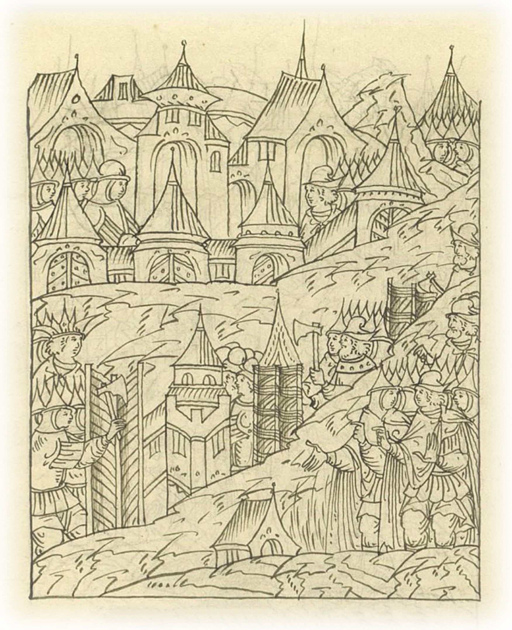 Языки говорят воеводам царя Ивана Васильевича, что магистр окопался большим рвом вокруг города Рындола, бьет из пушек и пищалей и приступает к Рындолу.