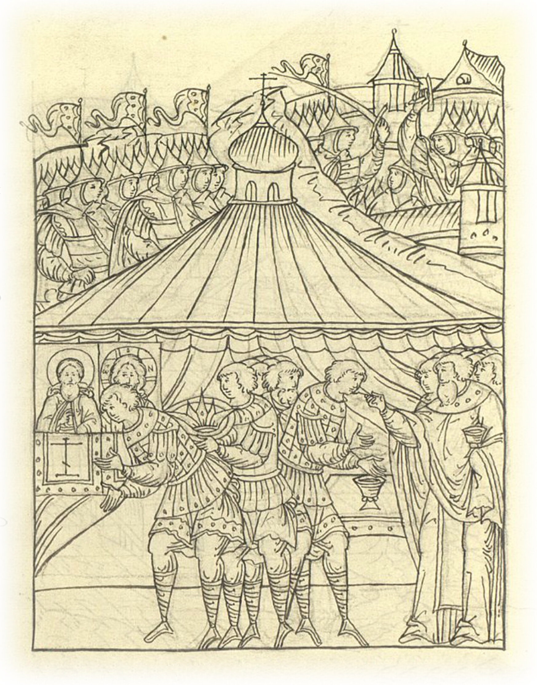 Царь Иван Васильевич прикладывается к иконе чудотворца Сергия и причащается.