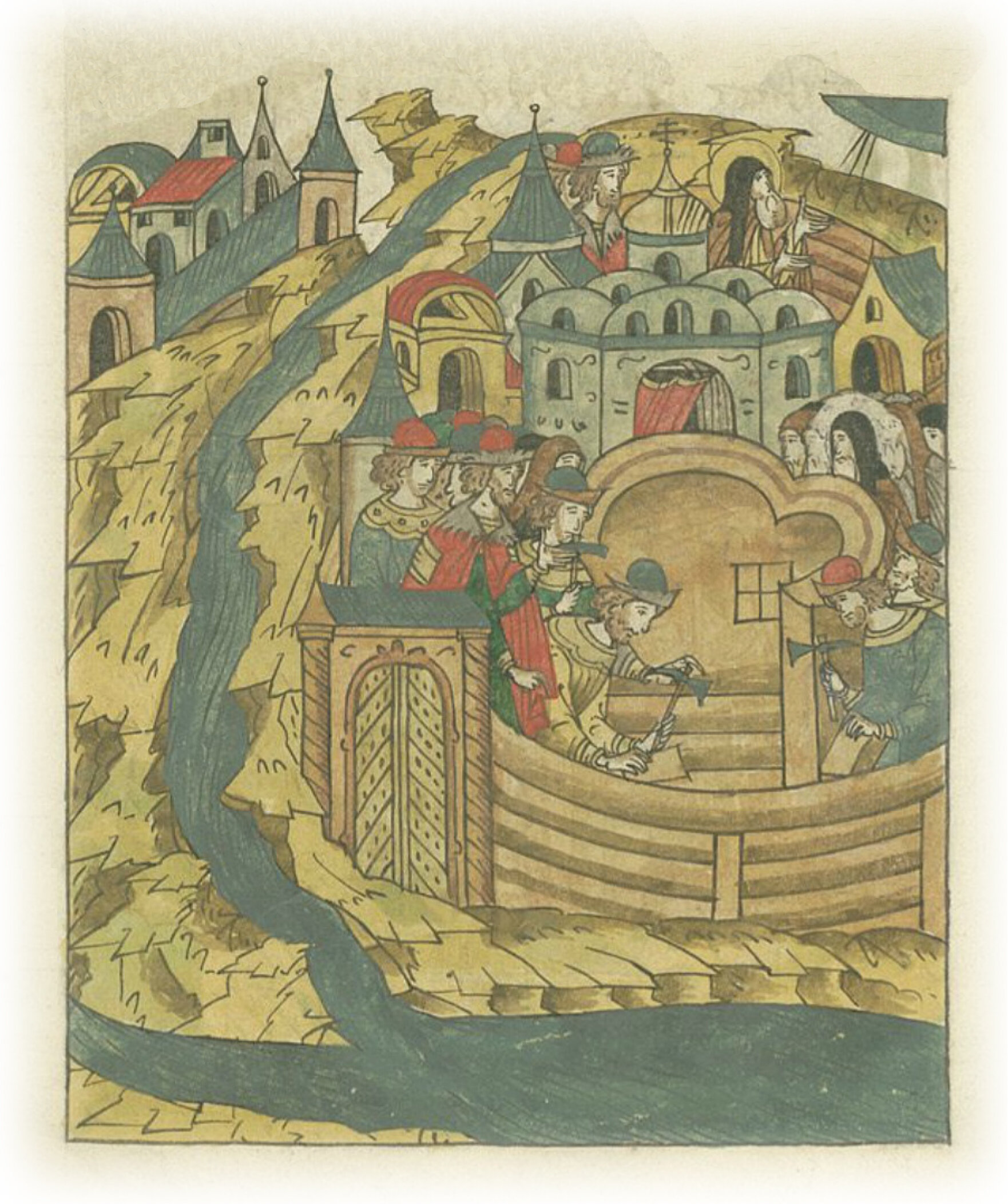 Повесть о преподобном Сергии Радонежском. Преподобный Сергий с князем Владимиром Андреевичем приходит в место Высокое на берегу реки Нары, основывает церковь во имя Зачатия пречистой Богородицы и общежительный монастырь и ставит туда игуменом своего учени