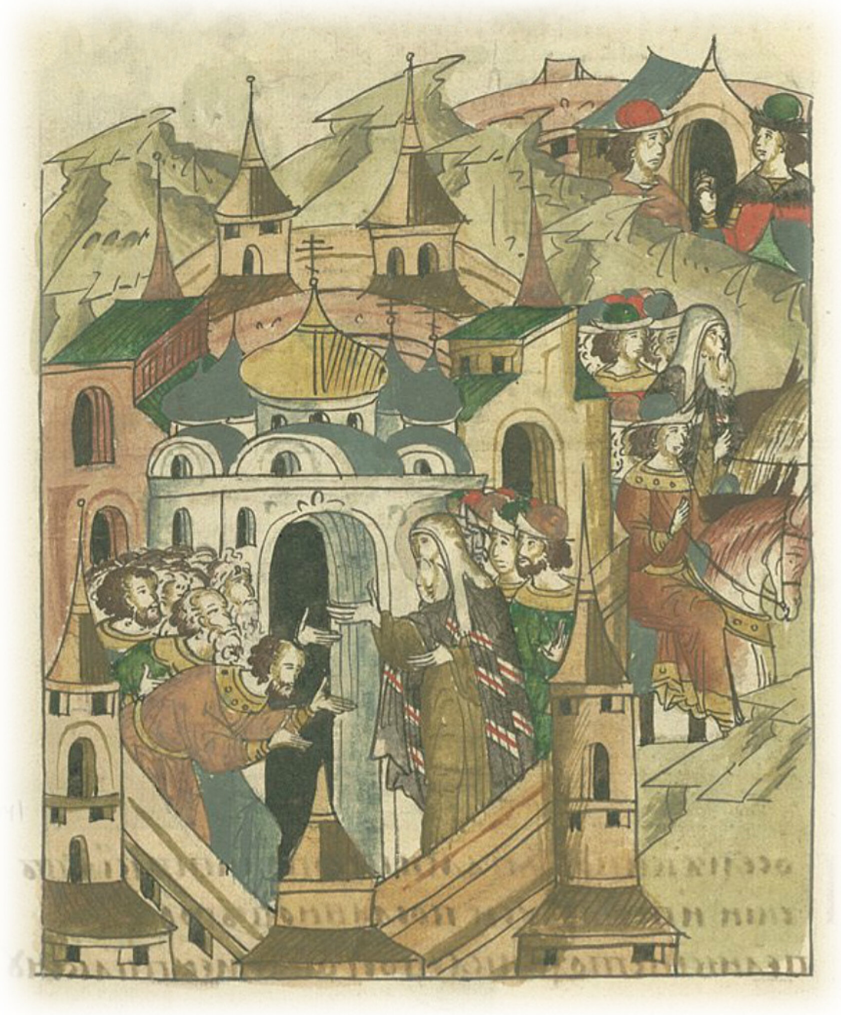 и весь Великий Новгород со слезами ударили челом своему господину владыке Иоанну, говоря: «Передай, господин, великому князю Василию Дмитриевичу благословение и замолви доброе слово за нас, за своих детей, за Великий Новгород». И владыка Иоанн пообещал им это, новгородцы отправили с ним своих послов, посадника Богдана Аввакумовича, Кирилла Дмитриевича и житийских людей*. * люди, несущие службу при дворе князя или в уездных городах, боярские дети.