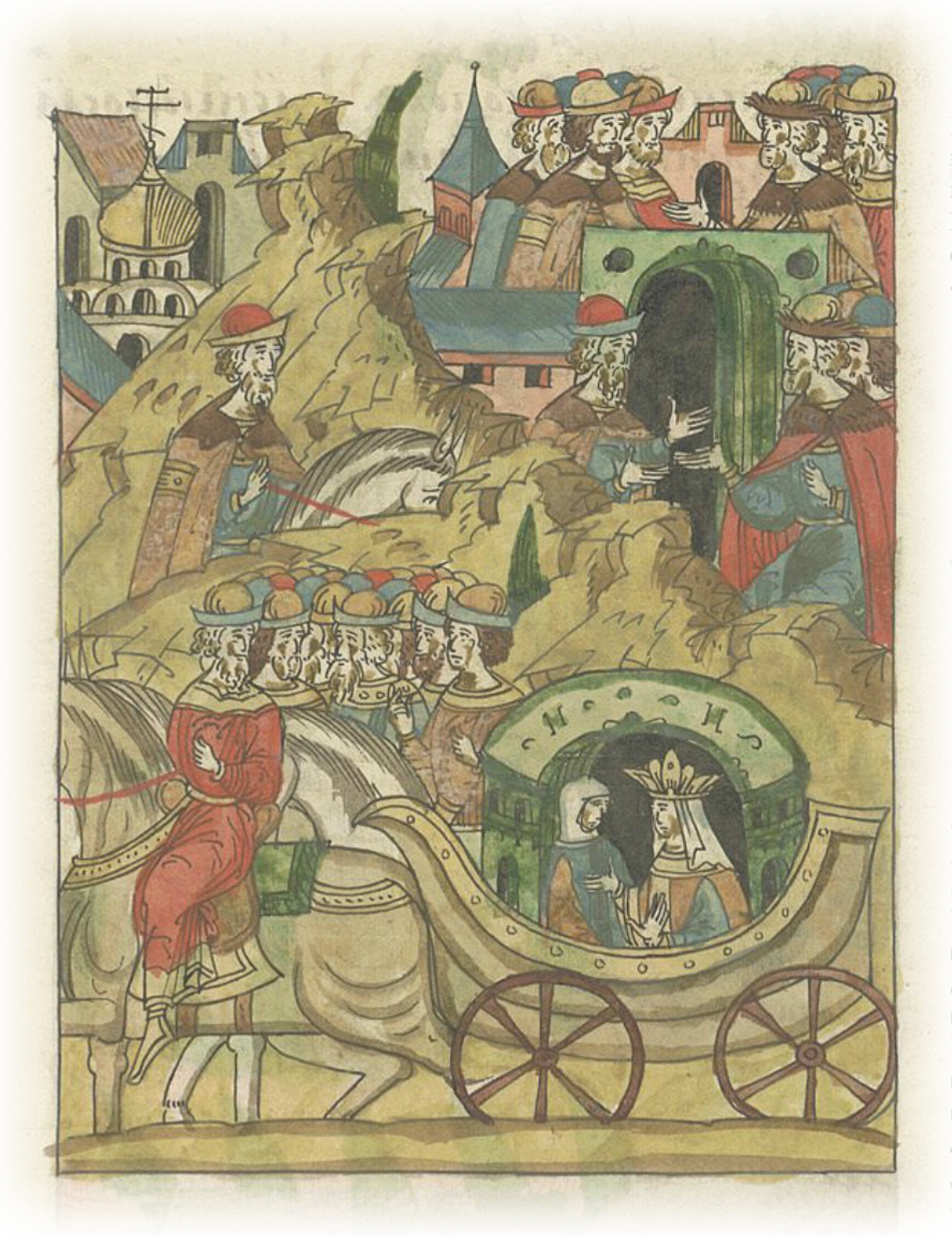 Боярин же великого князя пришел и передал эти слова князю Дмитрию и все другие. Князь же Дмитрий, обдумав с боярами своими, сказал: «Брат, зачем томить мне не просто тетку, но и госпожу свою великую княгиню? Сам бегаю, а люди самому нужны и уже устали; чем ее стеречь, лучше отпустить ее». И так решили отпустить ее из Каргополя; а с нею послал князь Дмитрий боярина своего Михаила Федоровича Сабурова, да детей боярских с ним.