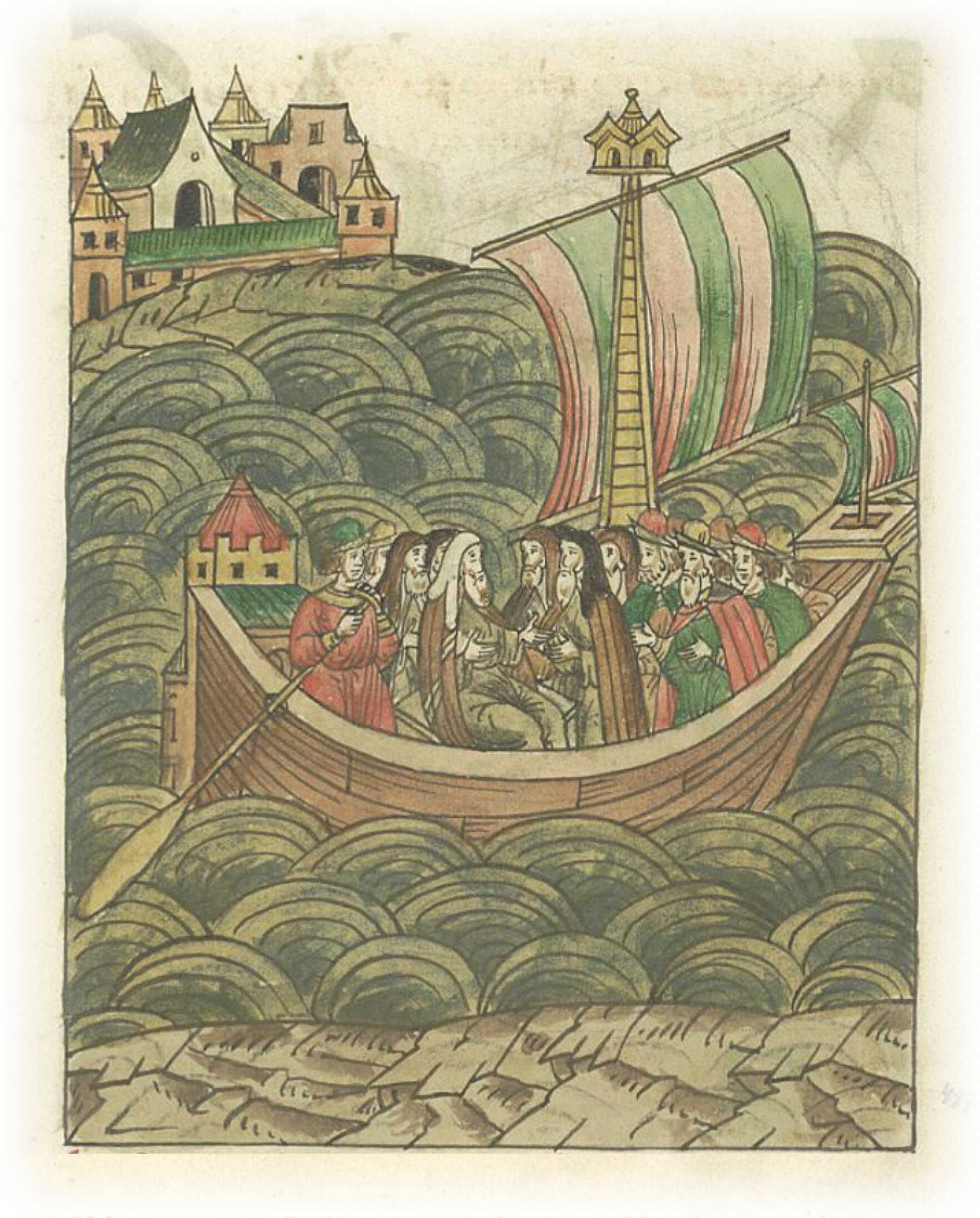 О походе митрополита Пимена в Царьград со Смоленским владыкой Михаилом и Спасским архимандритом Сергием. Отдав мзду напавшим фрягам, митрополит со спутниками плывет дальше.