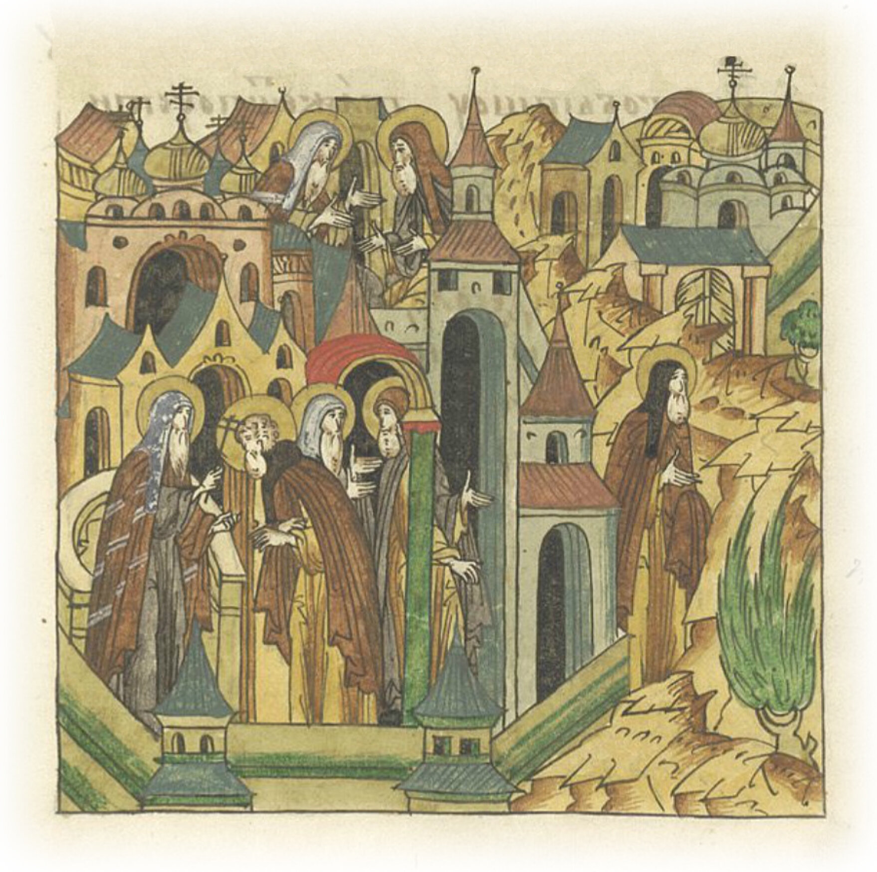 Повесть о преподобном Сергии Радонежском. Митрополит Алексей призывает к себе преподобного Сергия, желая оставить его после себя митрополитом всея Руси, но тот несколько раз отказывается, и митрополит отпускает его обратно в Радонеж.