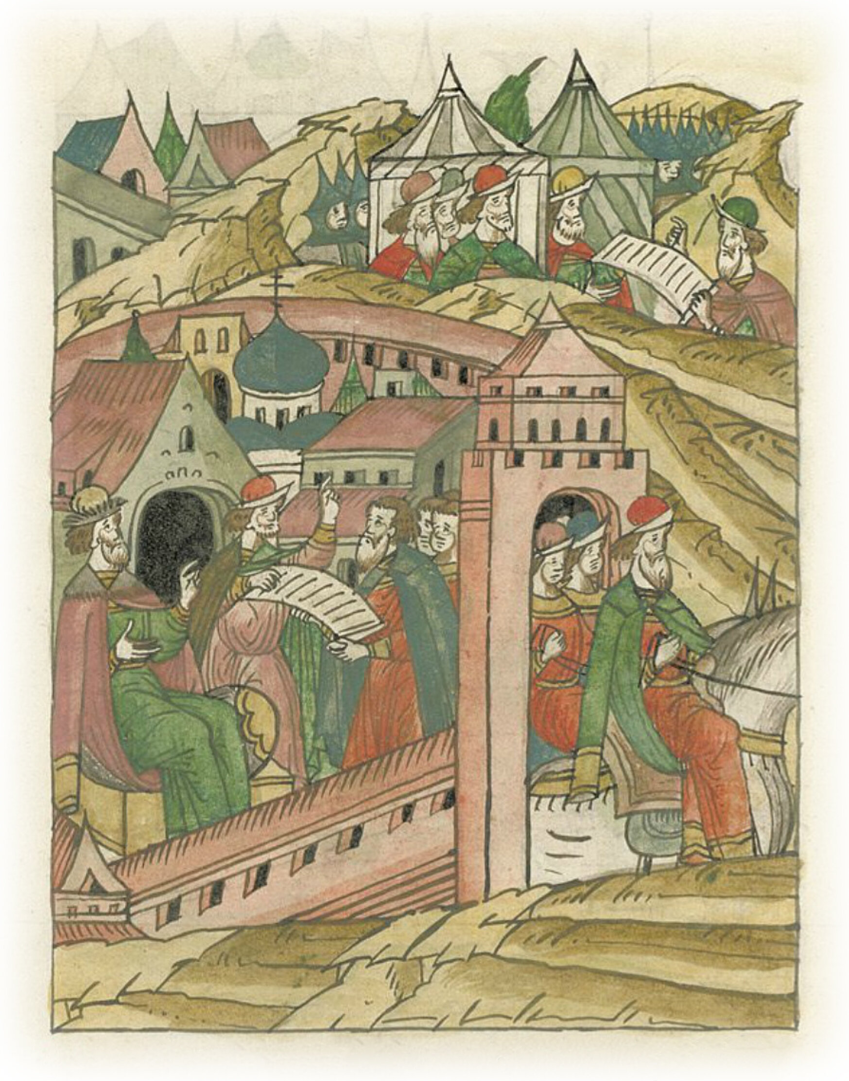 Ругодивские посадники Яким и Захар приезжают в Москву. Воеводы царя Ивана Васильевича Алексей Адашев и Иван Михайлов сообщают им, что государь пожалует их, если сдадут его воеводам помимо Ругодива Вышгород.