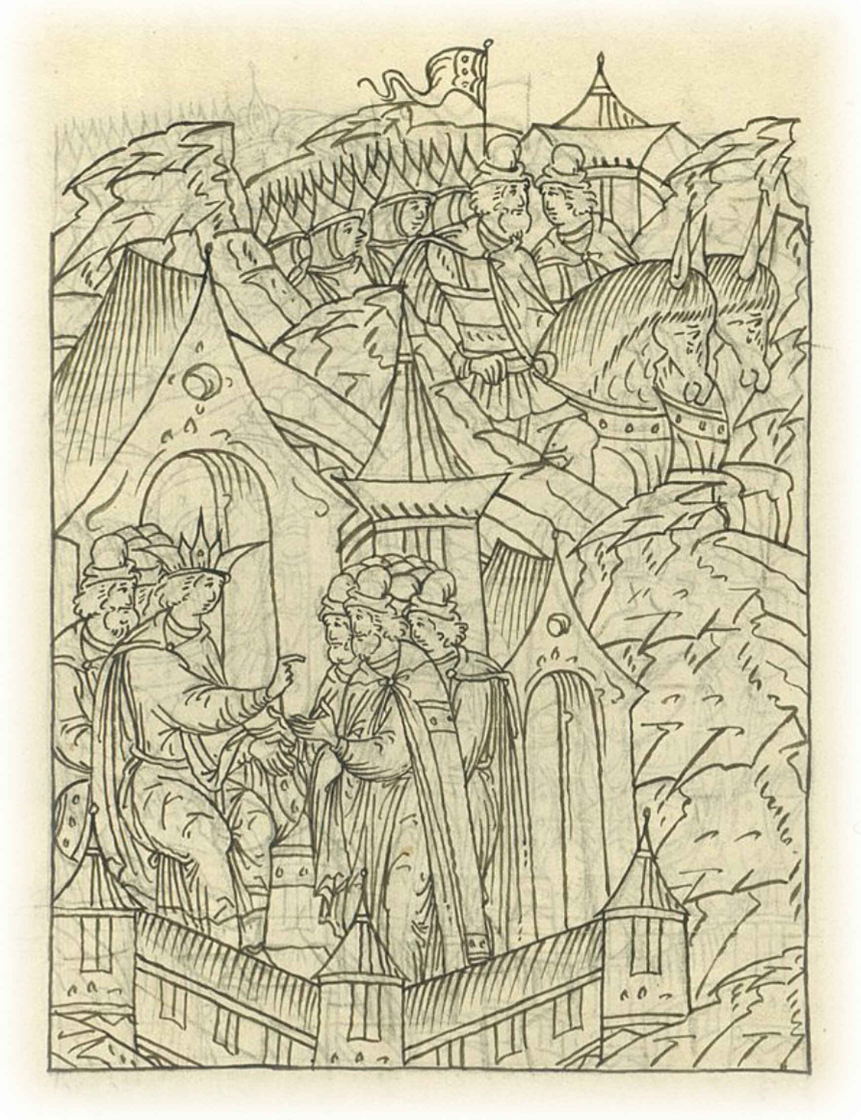 Ругодивские посадники Яким и Захар приезжают в Москву. Воеводы царя Ивана Васильевича Алексей Адашев и Иван Михайлов сообщают им, что государь пожалует их, если сдадут его воеводам помимо Ругодива Вышгород.