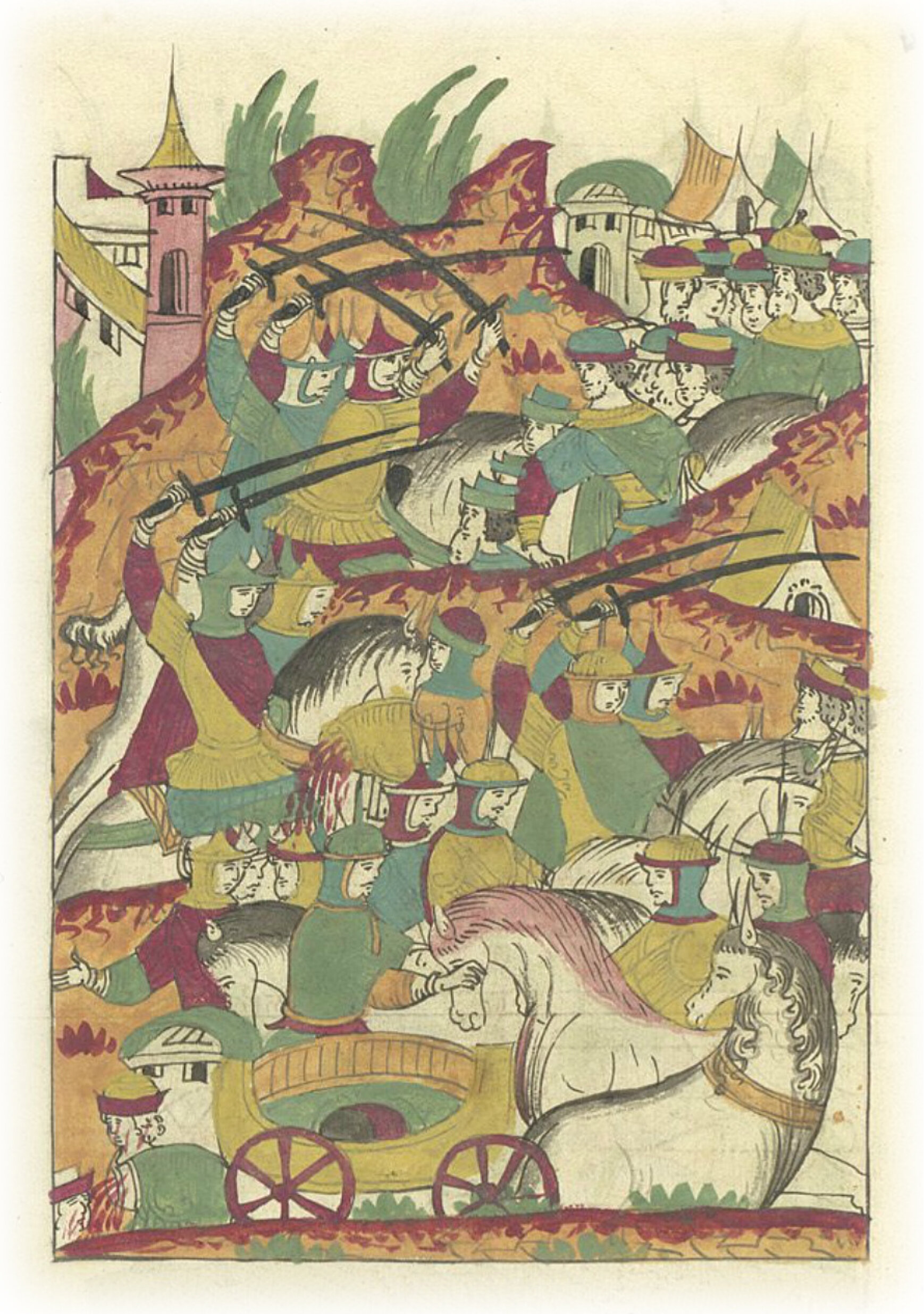 И немцы, увидев людей и не дождавшись воевод, побежали, и яртоулы гнались за ними верст с 15 и немногих людей догнали и побили, а телег и жеребцов много взяли.