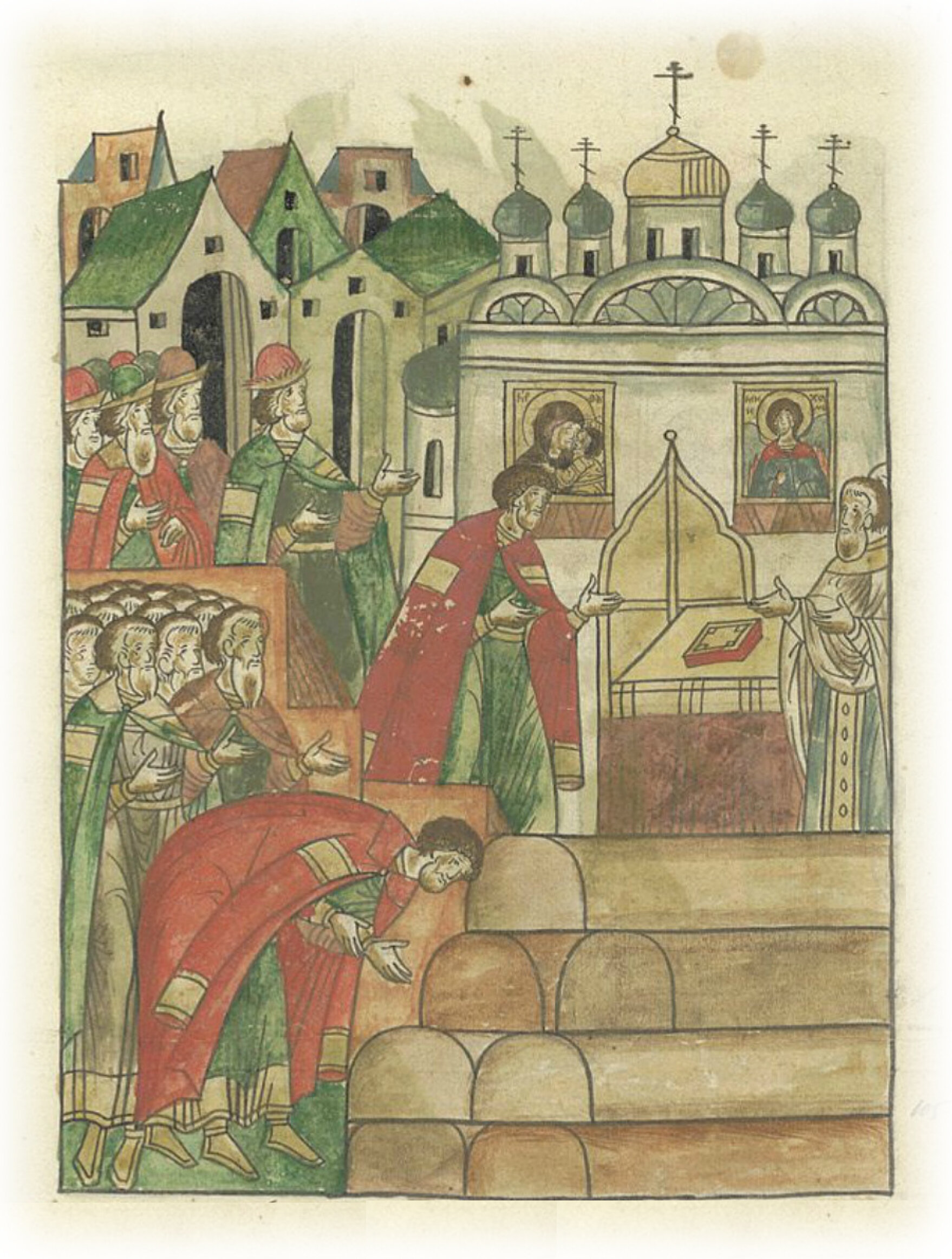 Князь же великий пошел в святую церковь святого архистратига Михаила, и у икон осенил себя крёстным знамением и помолился, и у гробов родителей своих простился и благословился.