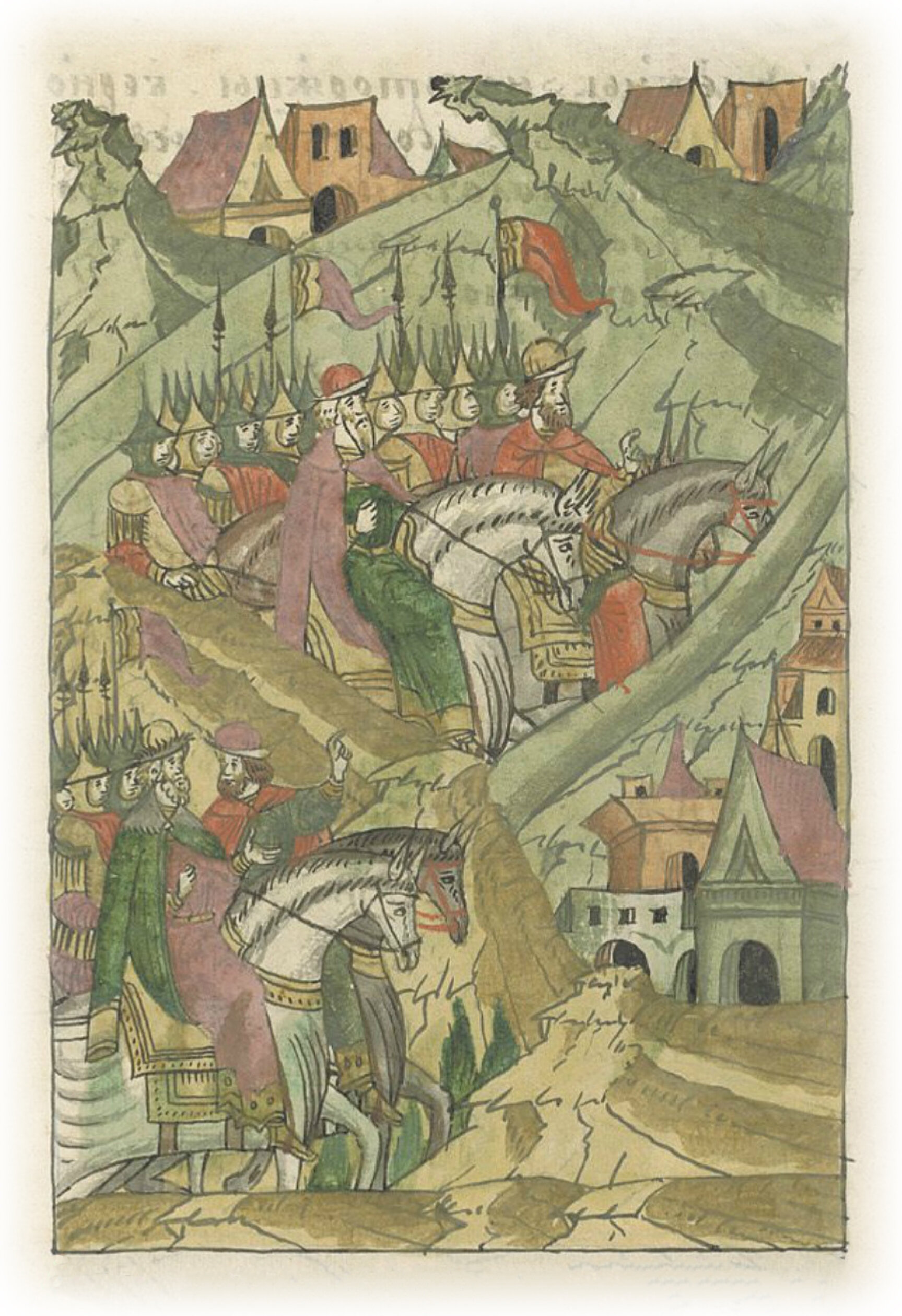 А между Демонской дорогой и Яжелбицкой велел идти князю Александру Васильевичу да князю Борису Михайловичу Оболенским; а с князем Александром – калужане, алексинцы, серпуховичи, хотунцы, москвичи, радонежцы, новоторжцы, берновцы и глуховцы; а с князем Борисом – можаичи, волочане, и звенигородцы, и ружане, которые служат великому князю.
