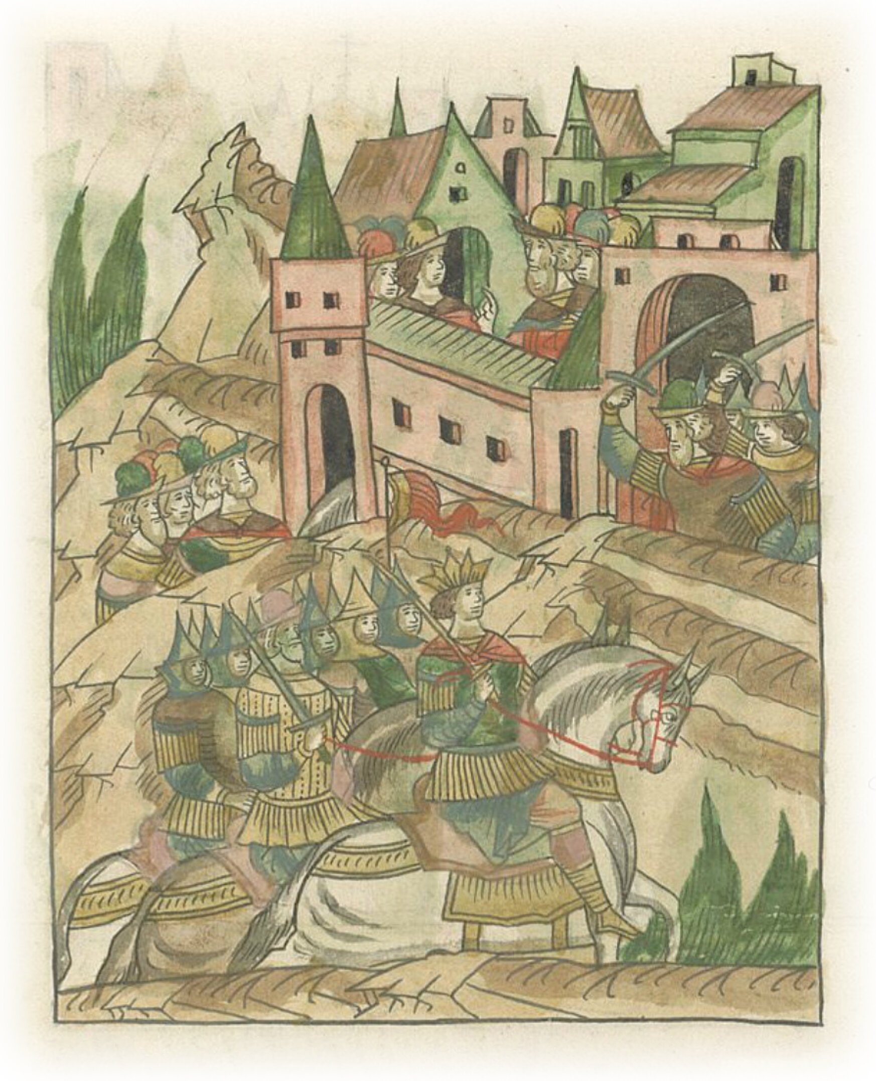 Языки говорят воеводам царя Ивана Васильевича, что магистр окопался большим рвом вокруг города Рындола, бьет из пушек и пищалей и приступает к Рындолу.