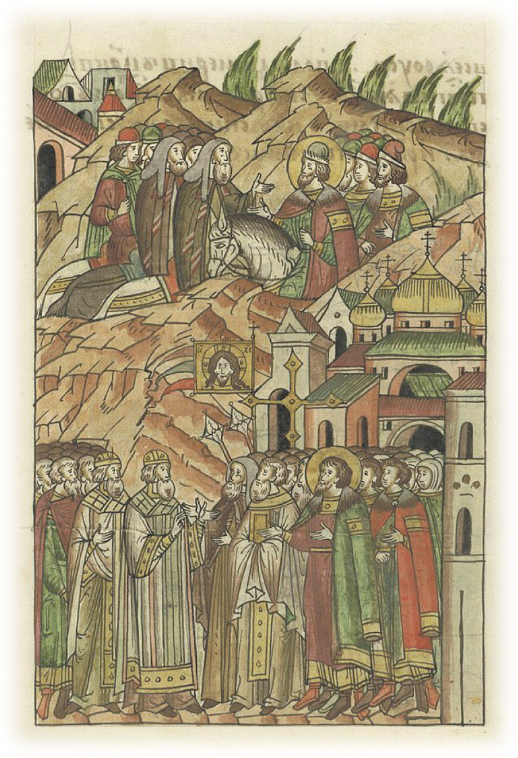 и великий князь Александр Ярославич со знатными мужами встретил его с честью великой; также встретил его с крестами весь освященный собор, архимандриты и игумены с множеством народа,