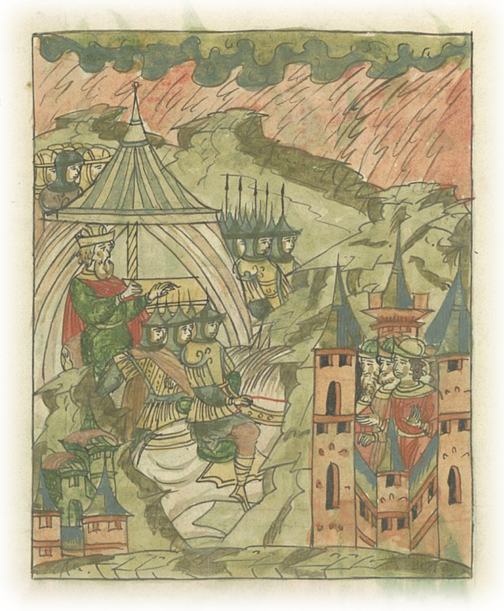 И пришел под другой город Вороноч, и расположился под ним с многочисленными своими войсками. И наползла страшная и грозная туча с сильным громом и сверкающими молниями, так что и Витовт, и находящиеся с ним уже отчаялись сохранить свою жизнь. И такой гром ударил с молниями, что земля сотряслась; Витовт же ухватился за шатерный столб и начал кричать: «Господи, помилуй!», стонал и трясся, думая о себе, что сейчас будет поглощен землей и сойдет в ад.