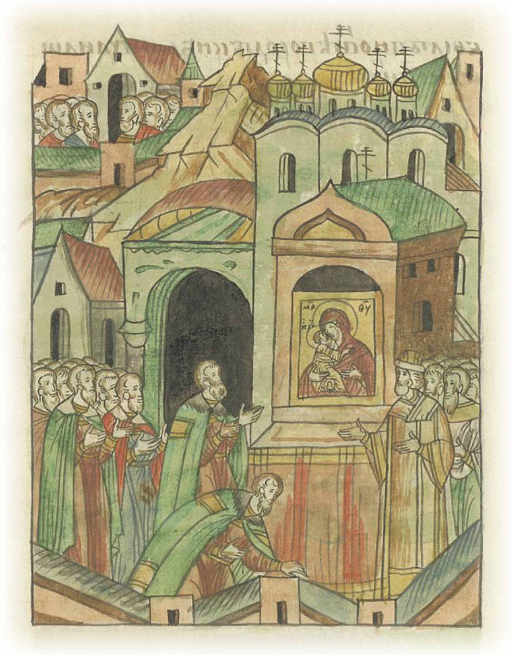 Великий князь Иван Васильевич совершает молебен в церкви пресвятой Богородицы у чудотворной иконы Владимирской Богородицы.