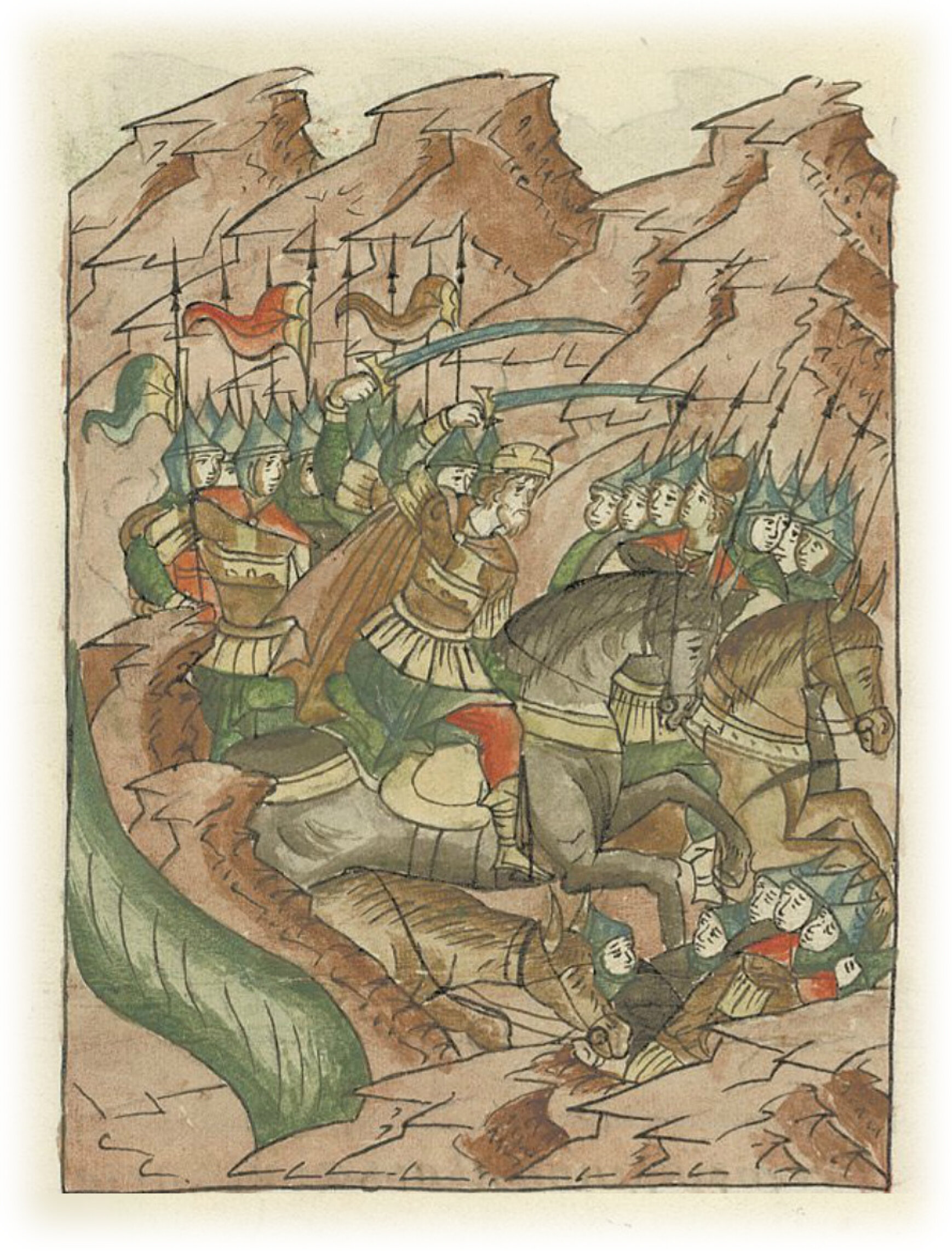 Князь же Галичский Мстислав Мстиславич с двадцатью тысячами воинов перешел Днепр к передовым татарским отрядам, сразился с ними и победил их, а оставшиеся в живых бежали с воеводою Гонябеком,