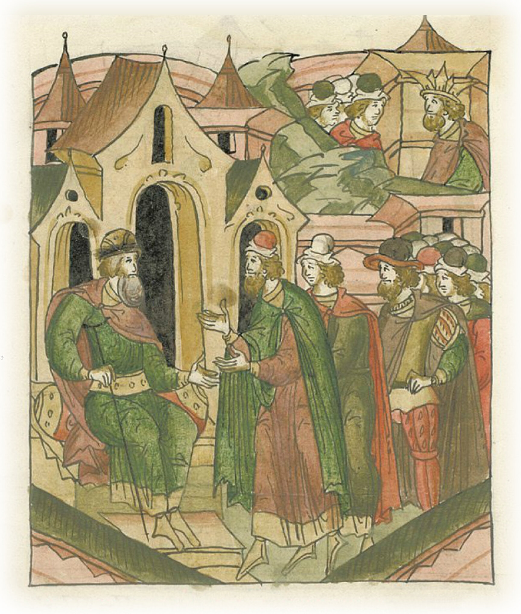 О приходе послов из Рима. Тем же летом (месяца) июля в 27 день пришел на Москву дьяк великого государя Владимир Семенов, сын Племянников, которого великий князь посылал к брату своему Максимиану цесарю. Да с ним вместе пришли к великому государю Василию на Москву от его брата избранного цесаря и наивысшего короля Римского Максимиана его послы, именем Фрютюшко да Колла*, да Онтони**. * Франциск да Колло. ** Антоний де Конти.