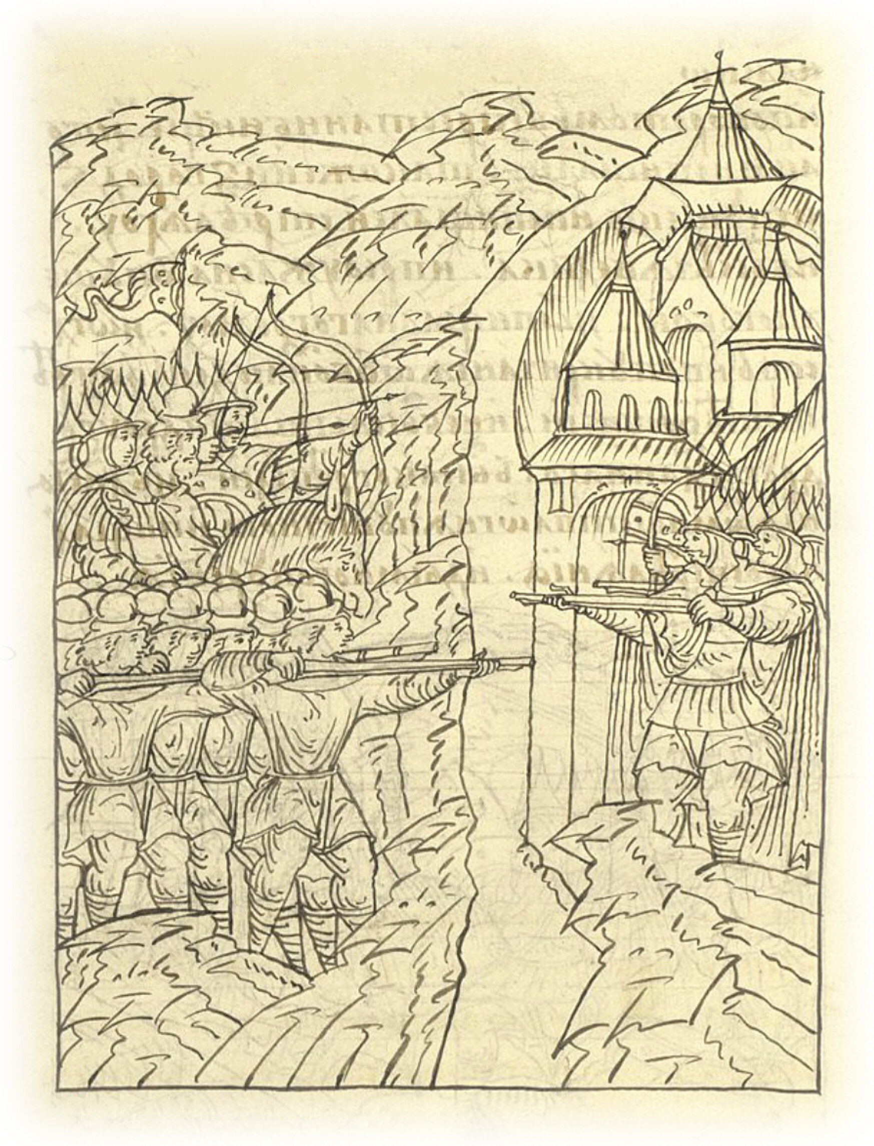 И встали головы стрелецкие и стрельцы, и головы с боярскими людьми и казаками вдоль рва вокруг города, и стреляли из пищалей и из луков.