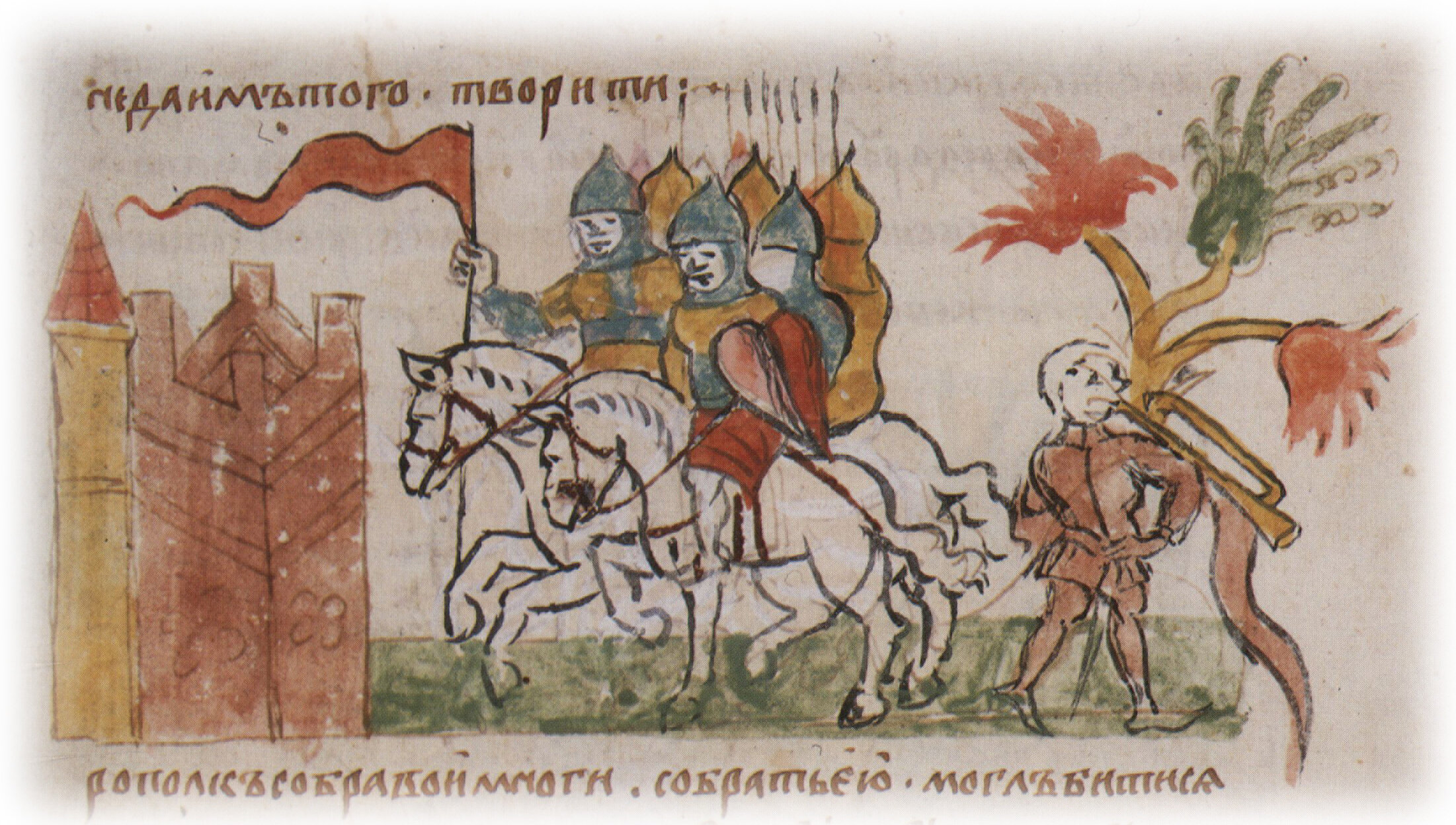 Рисунок "мастера Б" — перо. Правлен (фигуры, лица, шлемы, наконечники копий, щит, лошади, дерево) и дополнен (фигура справа, знамя) "мастера В" — кисть. Позднейшая пририсовка сбруи и стремени — перо.