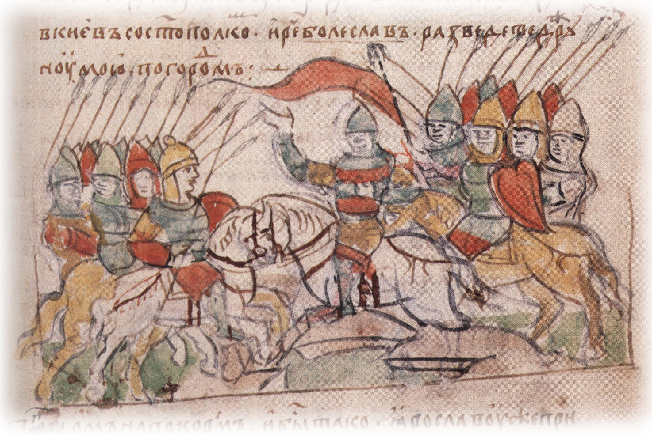 "В лето 6526. Поиде Болеслав со Святополком на Ярослава с ляхы. Ярослав же множество совокупи руси, варягы, словены, поиде противу Болеславу и Святополку, и прииде к Волыню, и сташа обапол реки Буга... И победи Ярослава Болеслав".