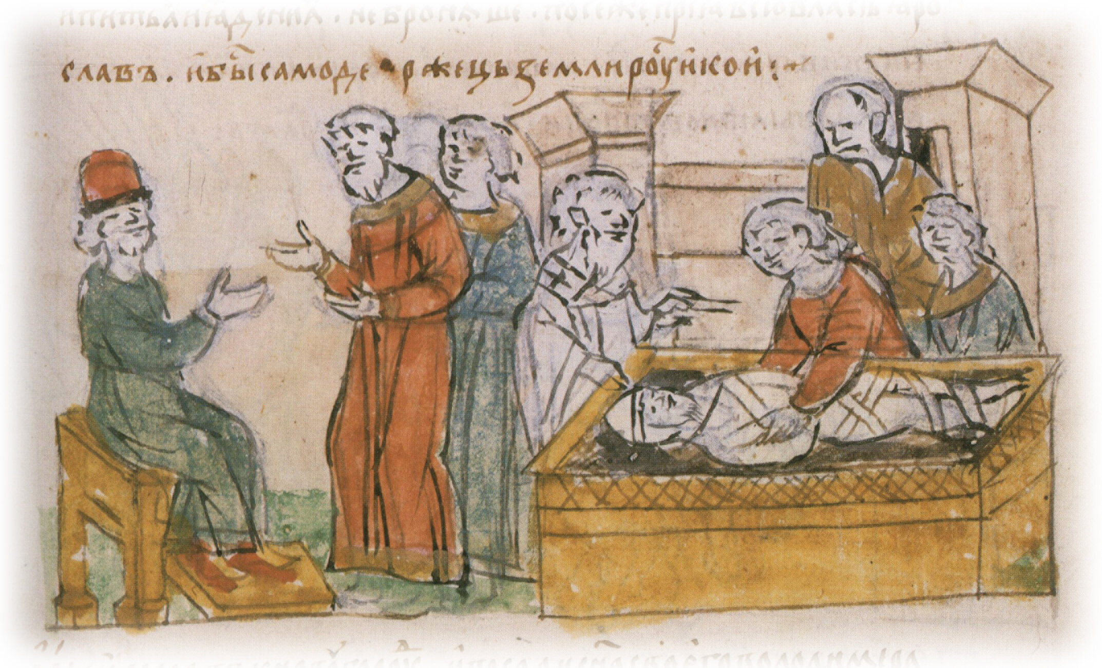 Тайное погребение Владимира Святославича, умершего в Берестове: спуск его тела на землю на ковре между разобранными клетьми здания; положение тела Владимира в мраморный гроб в церкви Святой Богородицы.