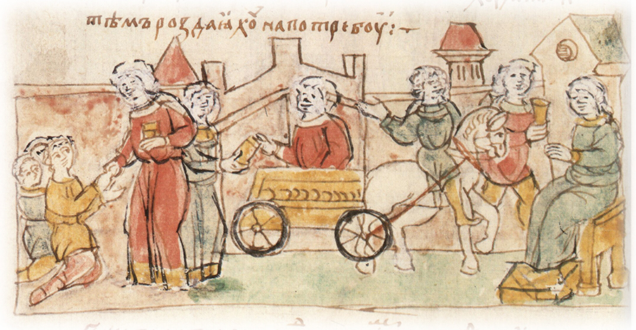 Раздача по повелению Владимира Святославича больным и нищим разных яств, развозимых на телеге: хлеба, мяса, рыбы, меда, кваса.