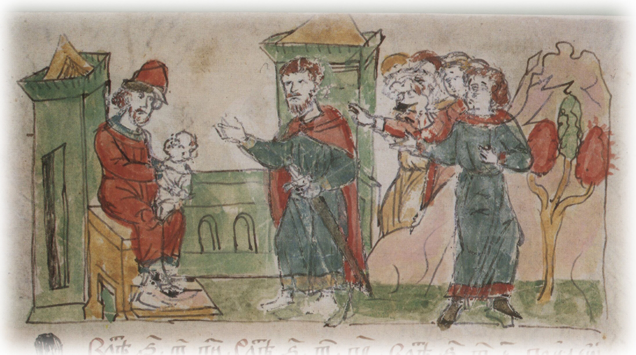 Тайное погребение Владимира Святославича, умершего в Берестове: спуск его тела на землю на ковре между разобранными клетьми здания; положение тела Владимира в мраморный гроб в церкви Святой Богородицы.