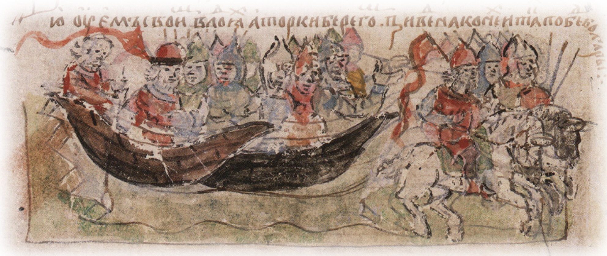 Поход против болгар, завершившийся победой Владимира Святославича, со своим дядей Добрыней на кораблях и на конях.