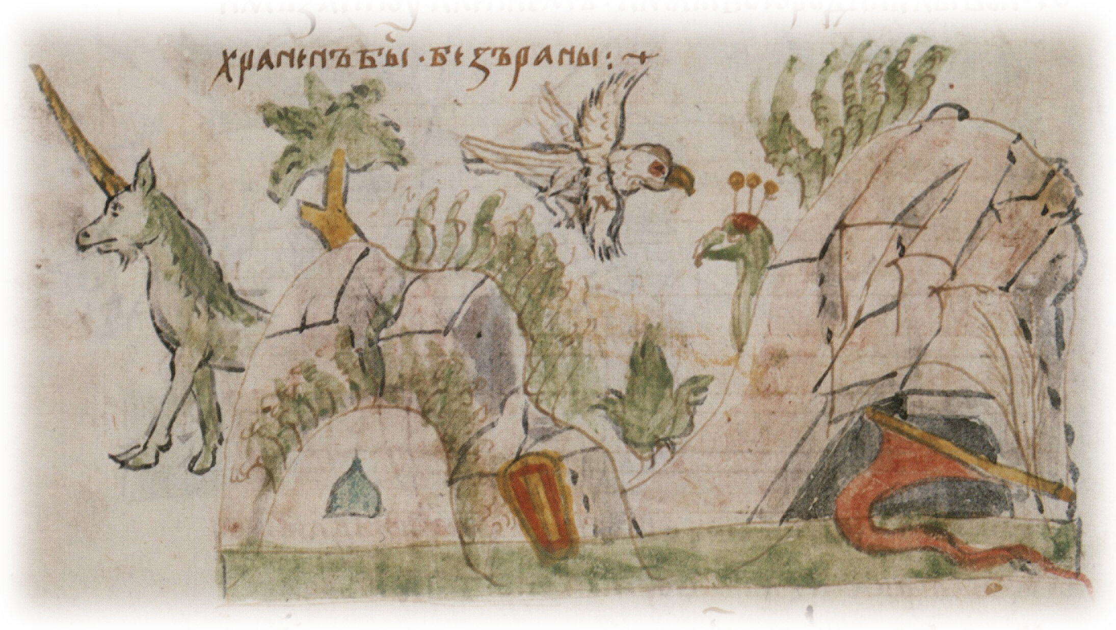 Рисунок "мастера Б" — перо. Правлен (холмы, дерево в центре, птица) и дополнен (единорог, шлем, щит, знамя, дерево слева) "мастера В" — кисть.