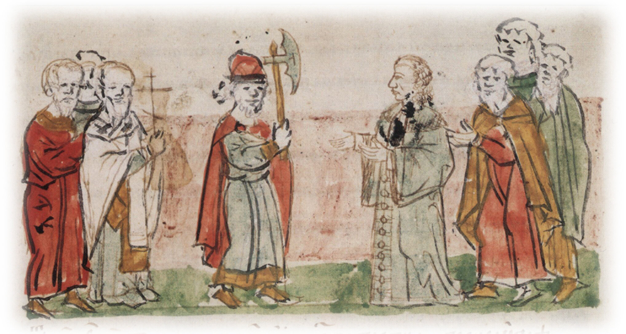 Сизов В. И. Миниатюры Кенигсбергской летописи // ИОРЯС. СПб., 1905. Т. 10. Кн. 1. с. 8; Артамонов М. И. Миниатюры Кенигсбергского списка летописи // Известия Государственной академии истории материальной культуры (далее: ГАИМК). Л., 1931. Т. 10. Вып. 1. с. 22; “Повесть временных лет”. Подг. текста Д. С. Лихачева. Пер. Д. С. Лихачева и Б. А. Романова. М.; Л., 1950 (серия “Литературные памятники”). вкл. к с. 129
