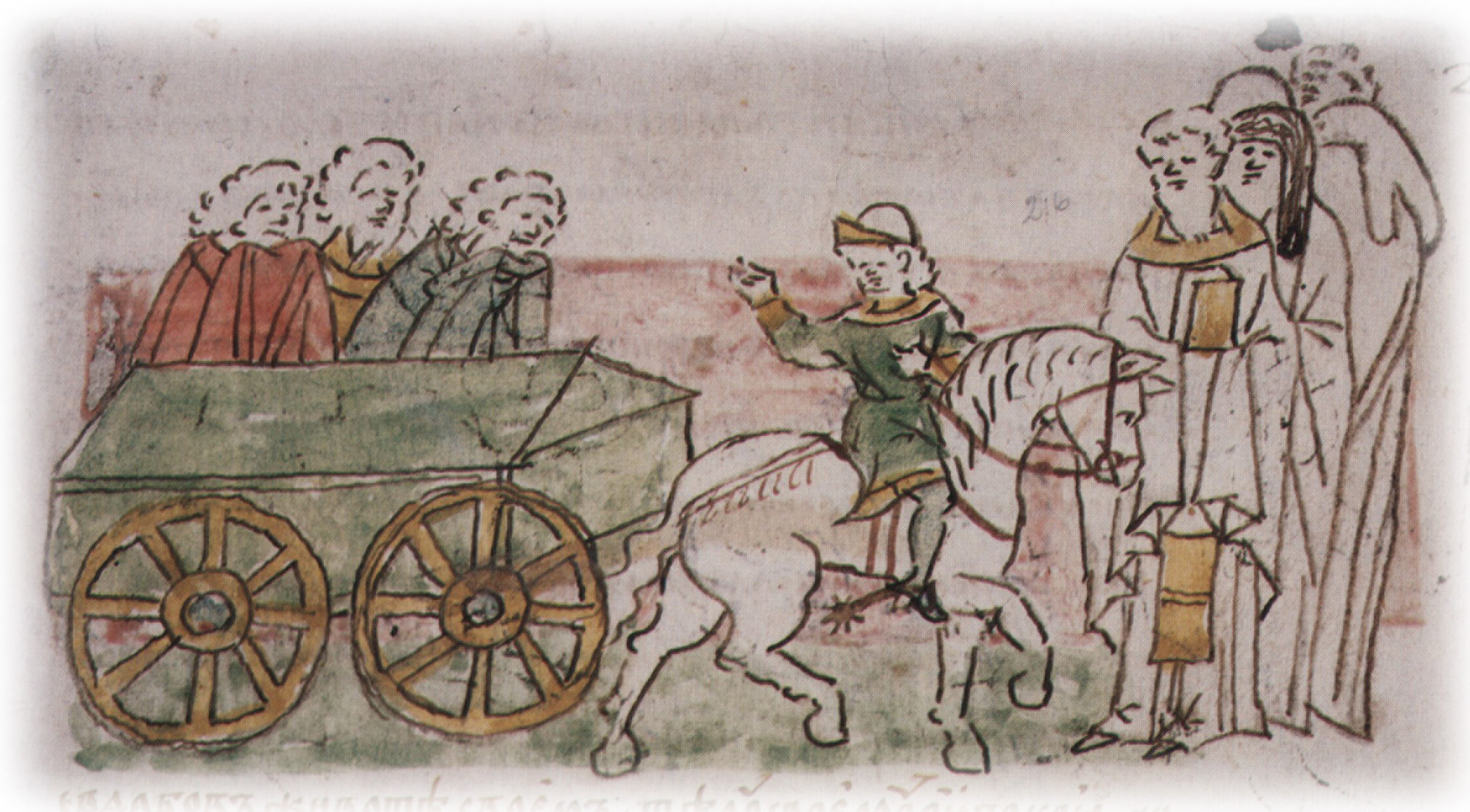 Рисунок "мастера В" — трость; последующая прорисовка — перо. Пририсовка сбруи и стремени — перо. Еще более поздняя пририсовка шпоры и заштриховка клобука — перо.