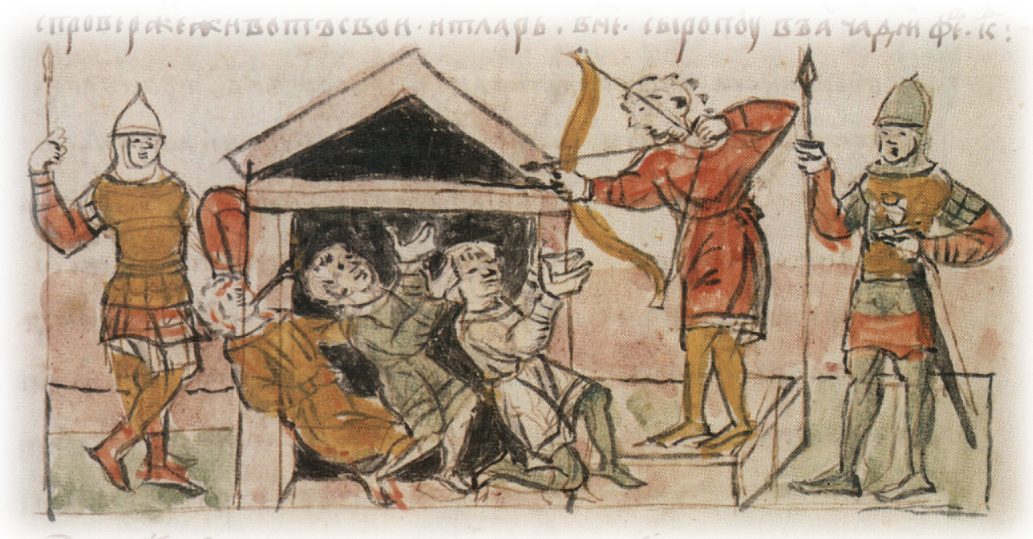 "Влез же на избу и прокопавше верх, и тако Олбег Ратиборич, приим лук свой, и наложи стрелу, и удари Итларя в сердце, и дружину его всю избиша".