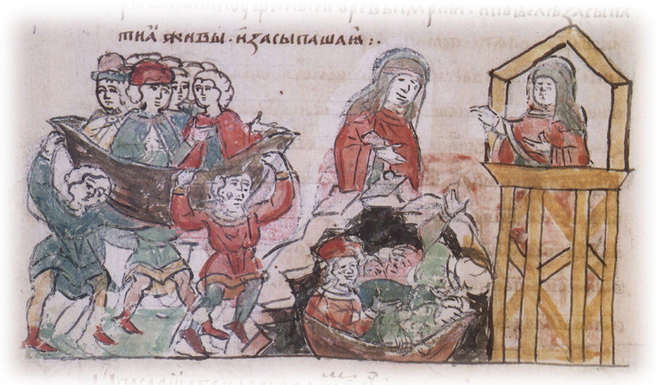Тайное погребение Владимира Святославича, умершего в Берестове: спуск его тела на землю на ковре между разобранными клетьми здания; положение тела Владимира в мраморный гроб в церкви Святой Богородицы.