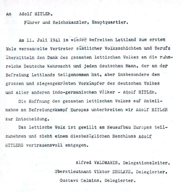 Текст телеграммы Адольфу Гитлеру от Собрания народных представителей Латвии Дата создания: 11 июля 1941 г.