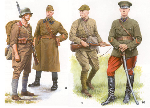 Реконструкция униформы военнослужащих Прибалтийских территориальных стрелковых корпусов РККА 1940 – 1941 гг.: 7. Красноармеец 24-го латышского территориального корпуса; 8. Капитан артиллерийского полка 24-го латышского территориального корпуса; 9. Красноа
