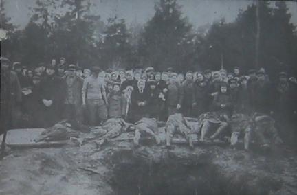 Эксгумация тел семи литовских крестьян деревни Кинчуляй, оказавших помощьсоветским партизанам и убитых за это бойцами Литовской освободительной армии.Август, 1944 г.