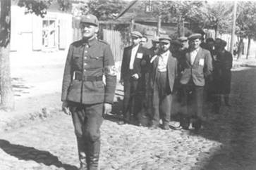 Боец «литовской самообороны» конвоирует группу арестованных евреев. Лето 1941 г.