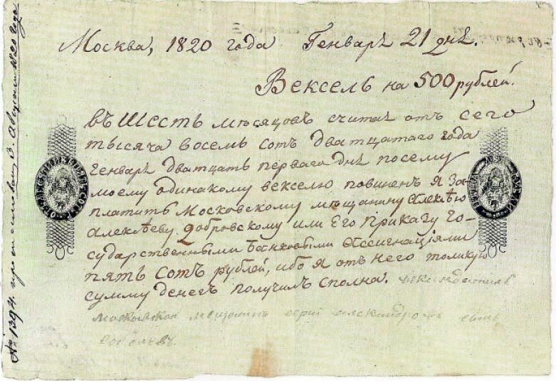 Сия форма векселей написана для показания как надлежит надписателям переводить платеж вместо себя на других, и могут такие надписатели быть и на прочих векселях, коим выше показаны образцы… В надписях кто похочет, тот упомянет, платеж получен от того, кому вексель дан, или глухо платеж получен не упоминая от кого, а ежели не похочет, то напишет, что содержание сего векселя заплати за меня тому то именем, под ним год и число и имя свое, как выше показано, ибо в том векселю никакого повреждения нет.