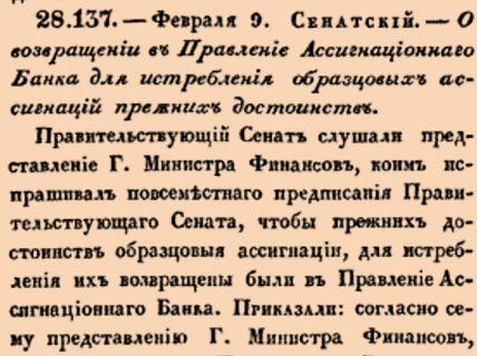 28137. 1820 год. 21 февраля (9 февраля ст.ст.) Сенатский. О возвращении в Правление Ассигнационнаго Банка для истребления образцовых ассигнаций прежних достоинств.Правительствующий Сенат слушали представление Г.Министра Финансов, коим испрашивал повсеместнаго предписания Правительствующаго Сената. Чтобы прежних достоинств образцовыя ассигнации, для истребления их возвращены были в Правление Ассигнационнаго Банка <…>