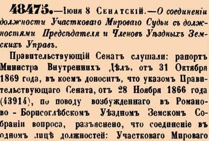 48475. 1870 год. 20 июня (8 июня ст.ст.) Сенатский. О соединении должности Участковаго Мироваго Судьи с должностями Председателя и Членов Уездных Земских Управ.Правительствующий Сенат слушали: рапорт Министра Внутренних Дел, от 31 Октября 1869 года, в коем доносит, что указом Правительствующаго Сената, от 28 Ноября 1866 года (43914), по поводу возбужденнаго в Романово-Борисоглебском Земском Собрании вопроса, разъяснено, что соединение в одном лице должностей: Участковаго Мироваго Судьи и Гласнаго Земскаго Собрания <…>