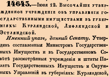 14643. 1841 год. 12 июня (24 июня). Высочайше утвержденное учреждение об управлении государственными имуществами в Губерниях: Курляндской, Лифляндской и Эстляндской.