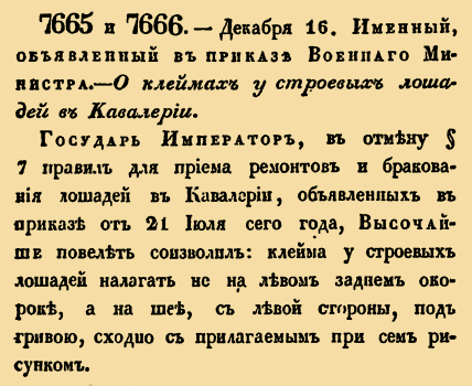 7665. Именный, объявленный в приказе Военного Министра. 28 декабря (16 декабря по ст.ст.) 1834 года. Царствование Императора Николая IО клеймах у строевых лошадей в кавалерии.Государь Император, в отмену правил для приема ремонтов и бракованных лошадей в кавалерии, объявленных в приказе от 21 июля сего года, Высочайше повелеть соизволил: клейма у строевых лошадей налагать не на левом заднем окороке, а на шее, с левой стороны, под гривою, сходно с прилагаемым при сем рисунком.