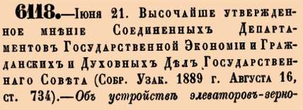 6118. 1889 год. 3 июля (21 июня ст.ст.) Высочайше утвержденное мнение Соединенных Департаментов Государственной Экономии и Гражданских и Духовных Дел Государственнаго СоветаОб устройстве элеваторов-зернохранилищ на девяти станциях Юго-Западных железных дорог, в городе Одессе и об отчуждении земли, принадлежащей Одесскому городскому обществу <…>