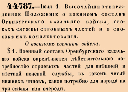44787. 1867 год. 13 июля (1 июля ст.ст.) Высочайше утвержденное Положение о военном составе Оренбургскаго казачьяго войска, сроках службы строевых частей и о способе их комплектования. О военном составе войска.№1. Военный состав Оренбургскаго казачьяго войска определяется действительною потребностию строевых частей для внешней и местной полевой службы, в таком числе нижних чинов, какое потребно для наряда на три смены или очереди <…>