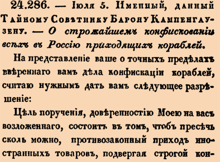 24286. 1810 год. 5 июля (17 июля). Именный, данный Тайному Советнику Барону Кампенгаузену. О строжайшем конфисковании всех в Россию приходящих кораблей.